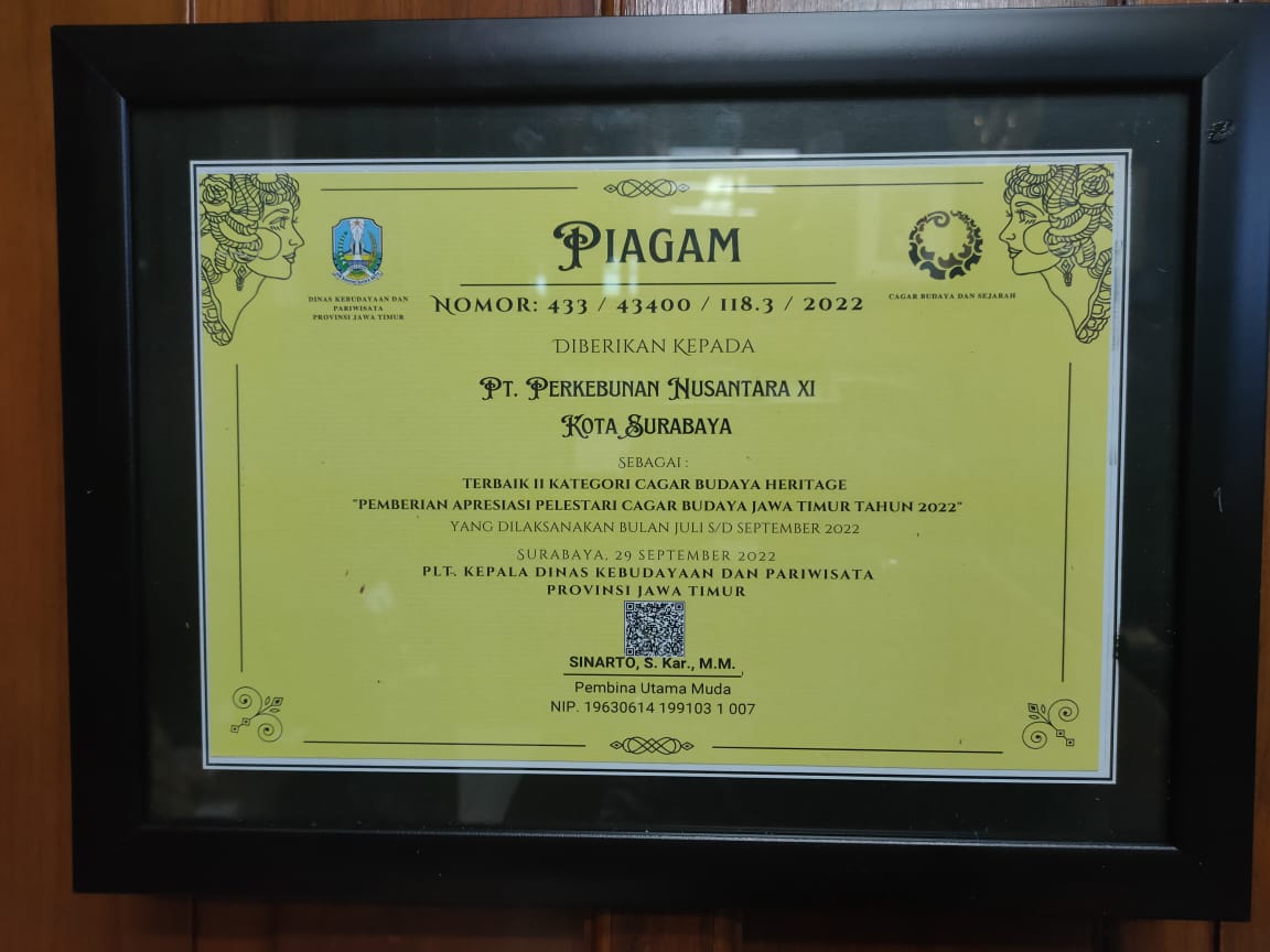 KILASJATIM. COM, Surabaya – PT Perkebunan Nusantara XI berhasil mempertahankan dan merawat bangunan Cagar hingga mendapat apresiasi pelestari cagar budaya tahun 2022 dari Dinas Kebudayaan & Pariwisata Provinsi Jawa Timur Kamis (29/09) di Surabaya.