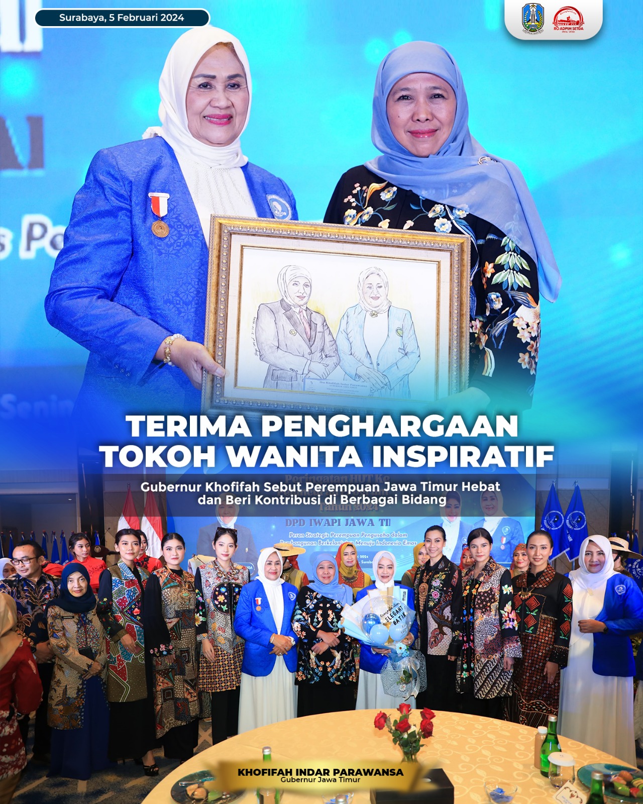 Piagam penghargaan diserahkan oleh Ketua Umum DPD IWAPI Jawa Timur Susmiati Rahmawati kepada Gubernur Khofifah. Penghargaan ini sendiri diberikan atas dukungan Khofifah kepada para wanita pengusaha di Bumi Majapahit.