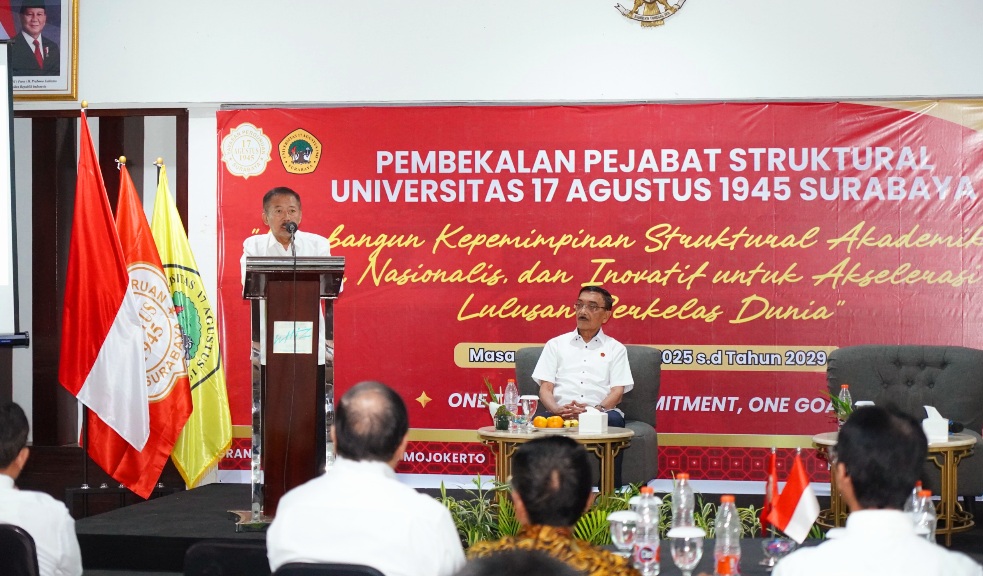 KILASJATIM.COM, Surabaya – Universitas 17 Agustus 1945 (Untag) Surabaya membekali 79 pejabat struktural periode 2025–2029 dengan strategi kepemimpinan PATRIOT guna mempercepat akselerasi mutu lulusan berkelas internasional. Kegiatan berlangsung 11–13 September 2025 di Hotel Grand Whiz Trawas, Mojokerto, diikuti jajaran rektorat, dekan, ketua program studi, hingga kepala unit kerja, serta 39 peninjau dari Yayasan Perguruan 17 Agustus 1945 (YPTA) Surabaya.