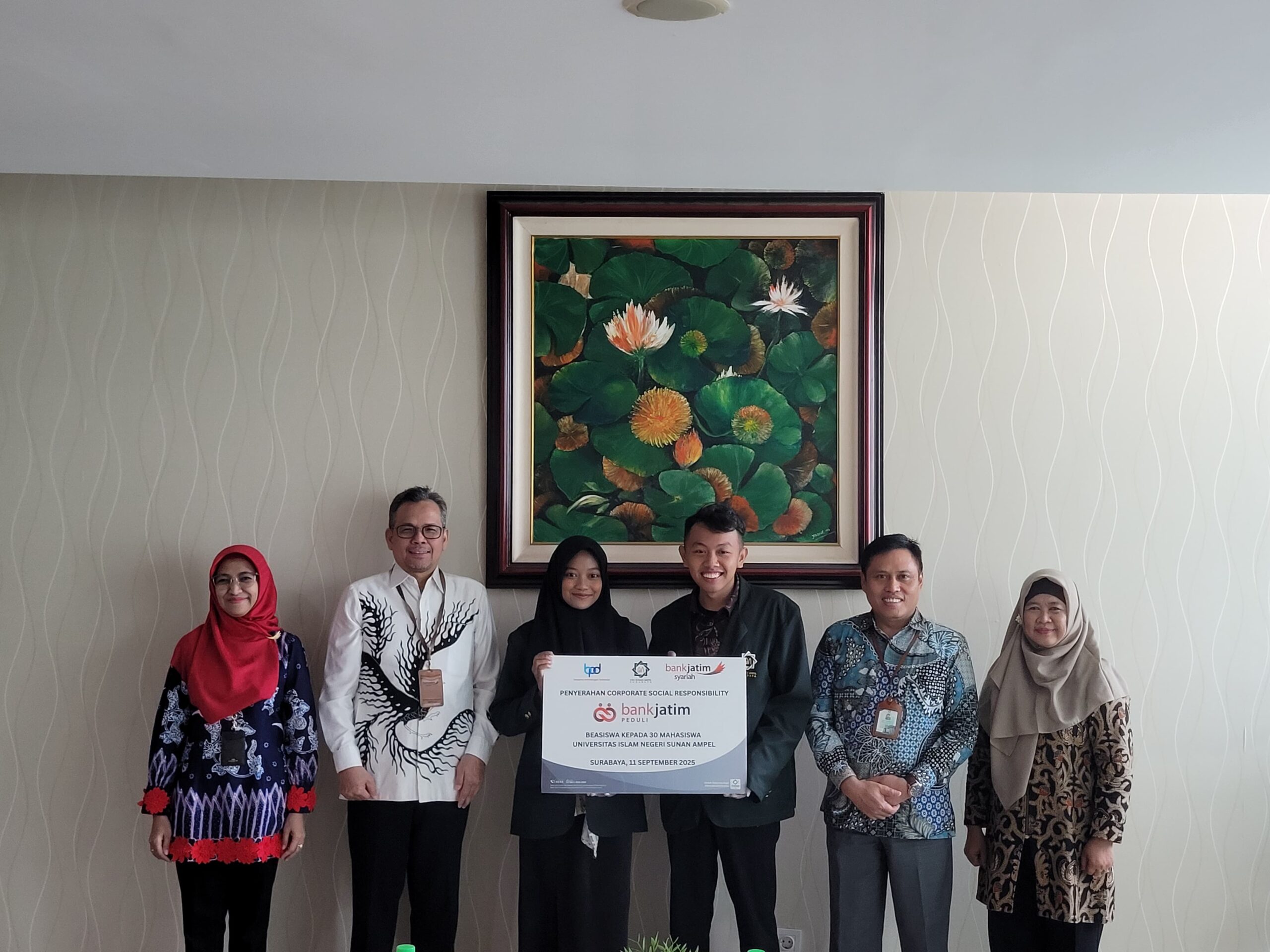 Sementara itu, pada hari Kamis (11/9), Bank Jatim Syariah juga melakukan penyerahan CSR kepada 30 mahasiswa Universitas Islam Negeri Sunan Ampel (UINSA) berupa beasiswa. Penyerahan CSR tersebut berlangsung di ruang meeting lantai 7 Gedung Teungku Ismail Yakub UINSA dengan menghadirkan 10 mahasiswa sebagai perwakilan penerima.