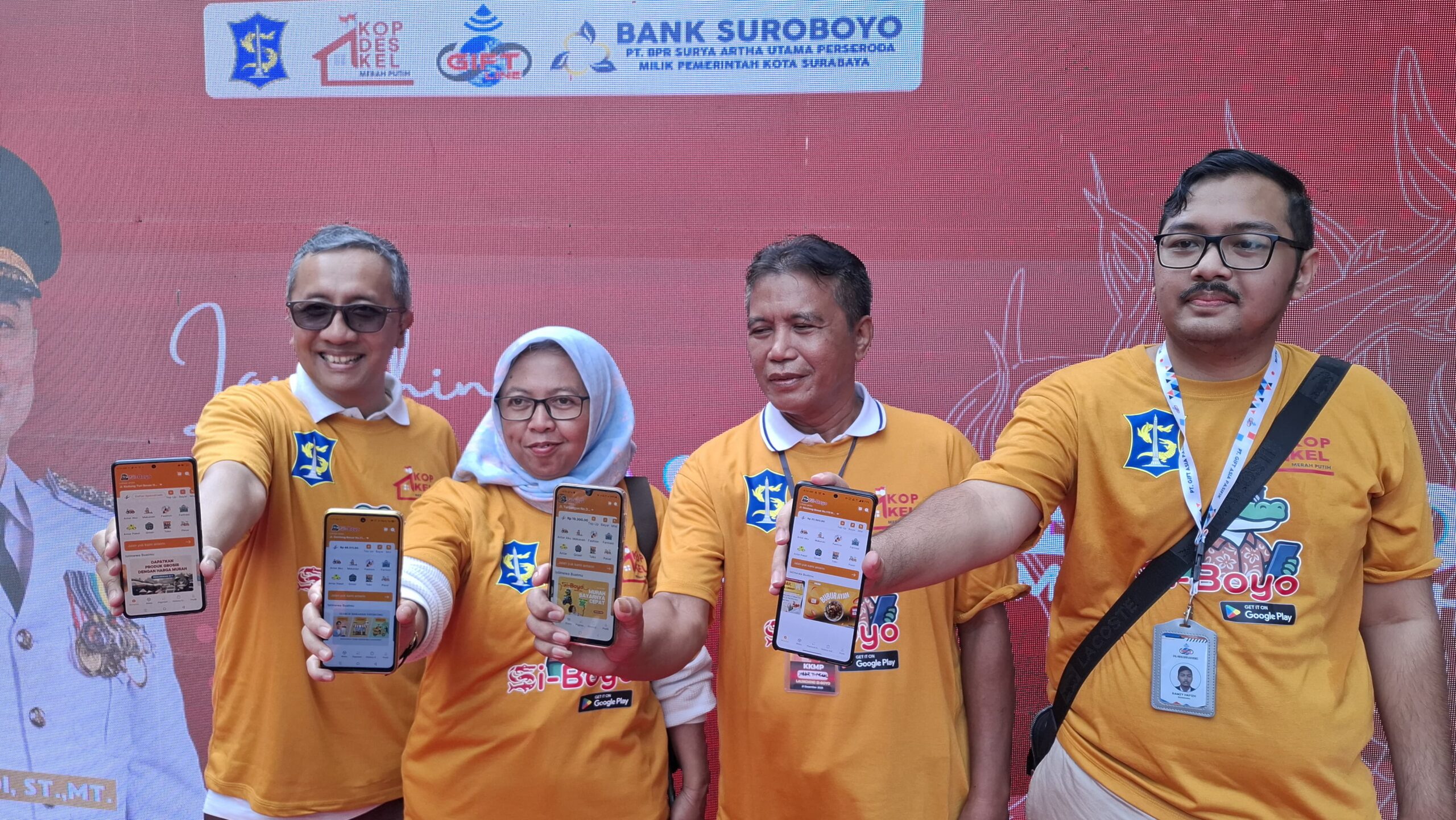 Seremoni peluncuran aplikasi Si-Boyo, bersama (dari kiri ke kanan) Ramzy Hafizh, Dirut GIFTLine, Febrina Kusumawati , Kadis Dinkopumdag,   Imam Sonhaji [Staff Ahli Pemerintah Kota Surabaya], Ririn Dwi Setyoningsih , Direktur Operasional Bank Suroboyo], dan  Rudy Hartanto, Partner Investor Si-Boyo, Minggu (21/12/²025) di CFD Tunjungan, (ist/dok)