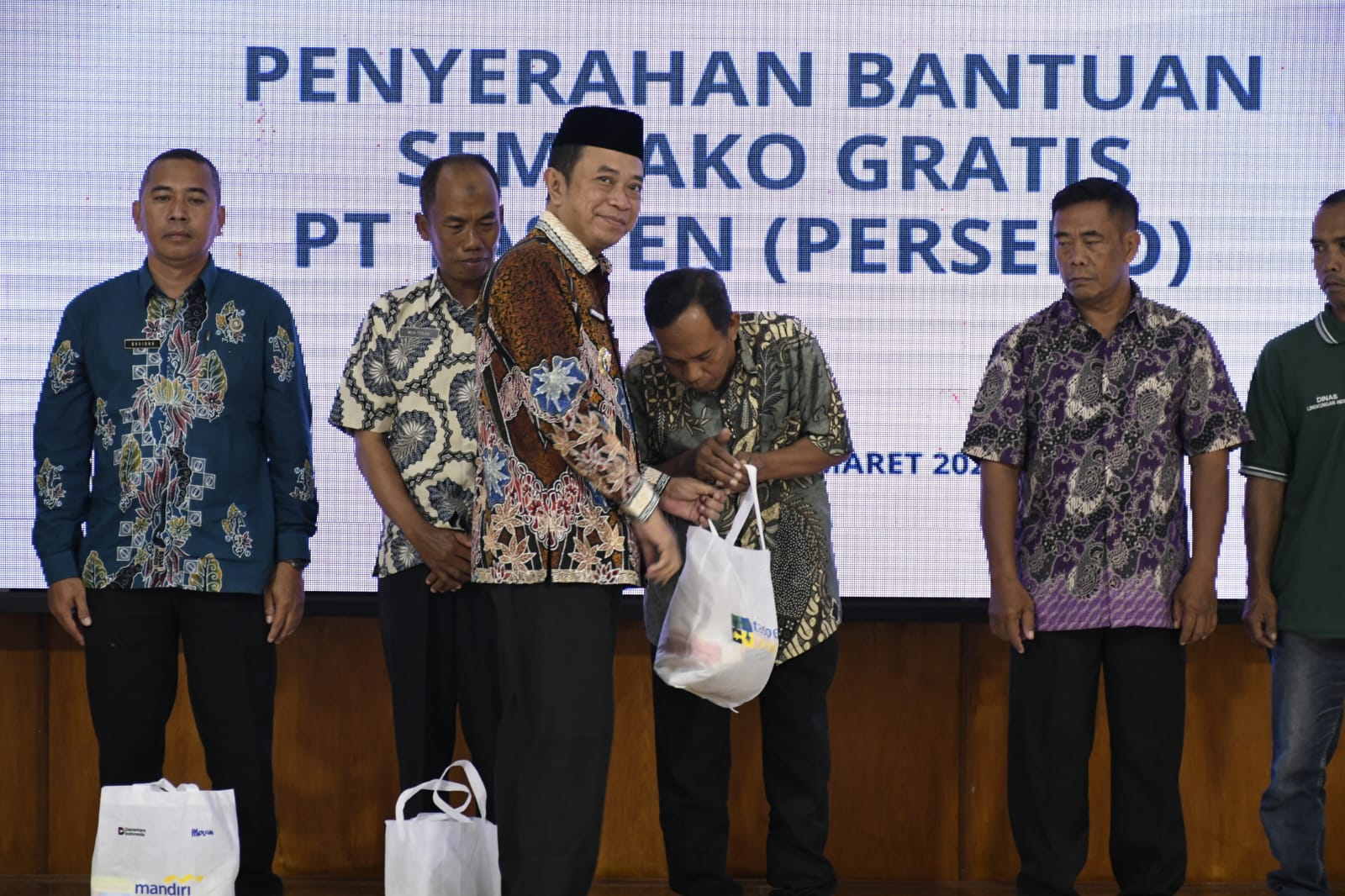 Bupati juga memberikan penghormatan khusus kepada para penerima bantuan yang sebagian besar berasal dari Dinas Lingkungan Hidup, terutama para petugas kebersihan atau yang sering disebut sebagai “pasukan kuning”.